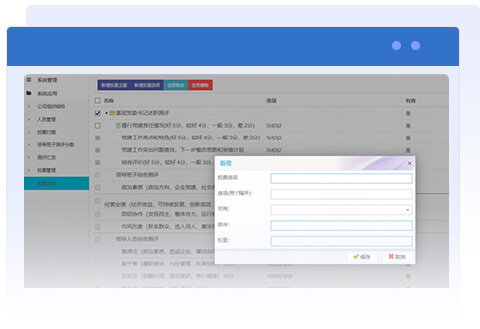 綜合測評系統(tǒng)為領(lǐng)導(dǎo)人員、中層干部、一般人員的綜合考核測評提供服務(wù),支持電腦、手機在線打分。支持自定義打分投票主題、投票項組合、投票二維碼自動生成等,自定義測評單位、對象、權(quán)重、對應(yīng)關(guān)系等。實現(xiàn)掃描一張二維碼完成所有測評內(nèi)容,測評報表一次成型、實時更新。支持在一場會議中,同時有多個不同的投票需求,可以將多個投票打捆,生成一個二維碼,用戶掃碼一個二維碼,即可進行多個投票的打分操作,以免造成二維碼數(shù)量過多,造成混亂。